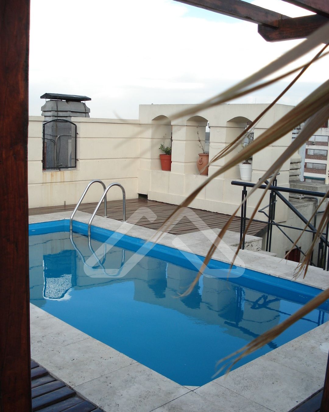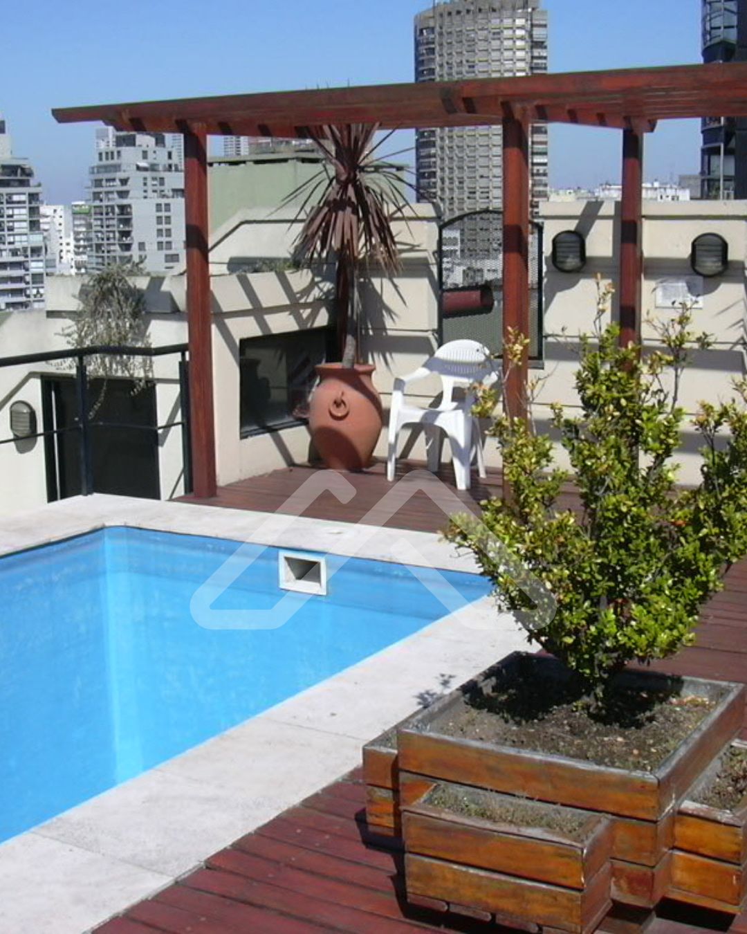 Edificio moderno con terraza con solarium y piscina.